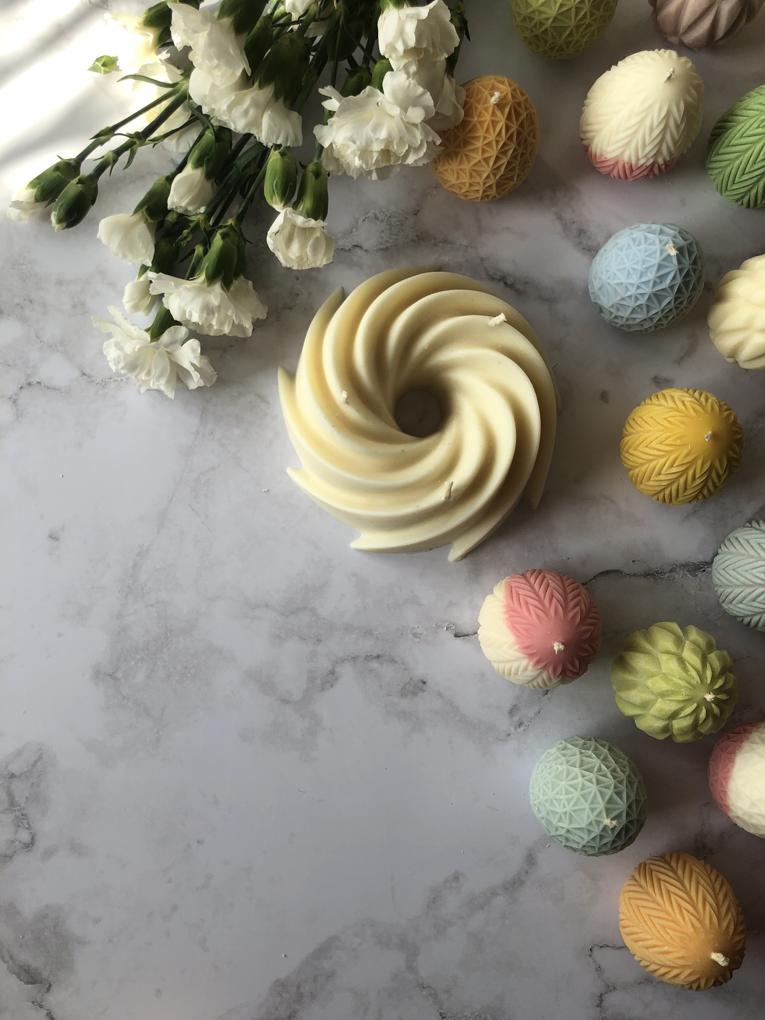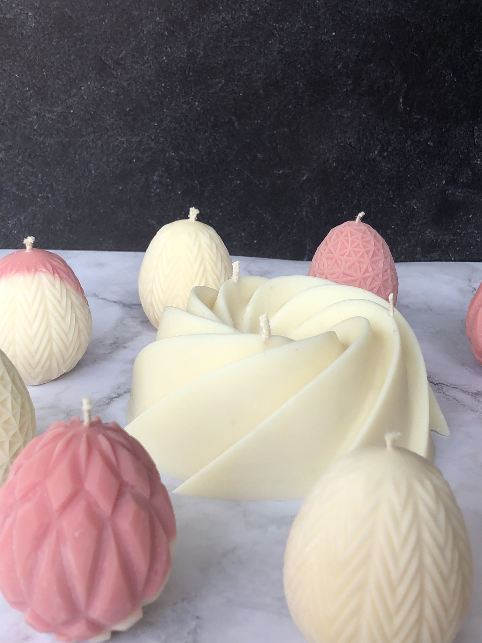Ręcznie robiona świeca sojowa w kształcie ciasta –dużej babki. Świeca, która odmieni twoje wnętrza, nadam im charakteru i dopełni świąteczny, wiosenny wystrój. Czysta prostota składu i formy- bez dodatków; w naturalnym kolorze wosku (od złamanej bieli po ecru), posiada 3 knoty bawełniane.