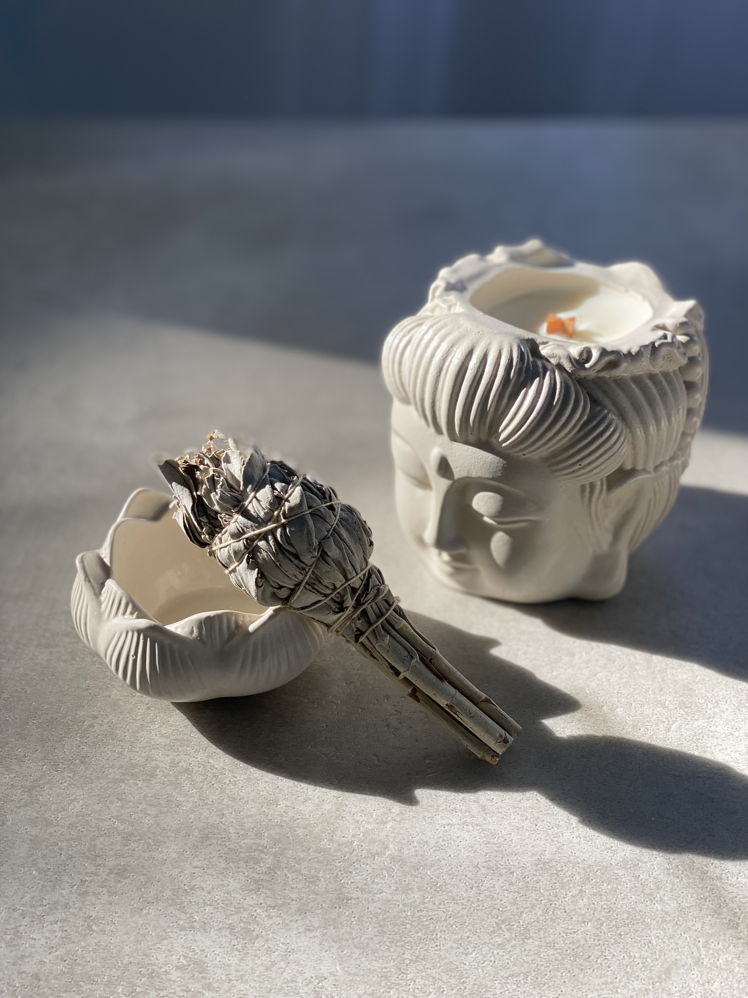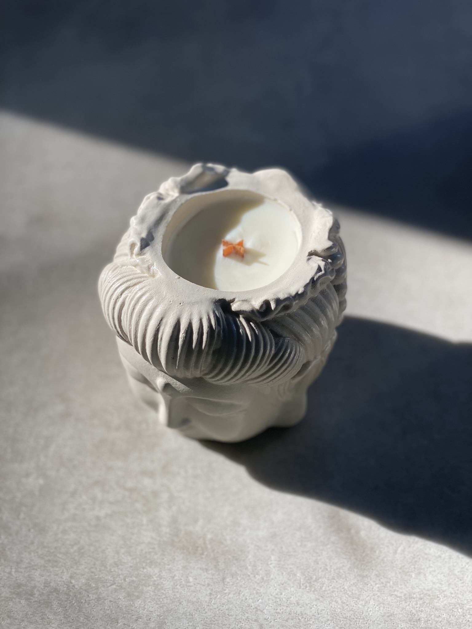 Świeca dostępna w pojemniku w naturalnym (jasnoszarym) kolorze gipsu.