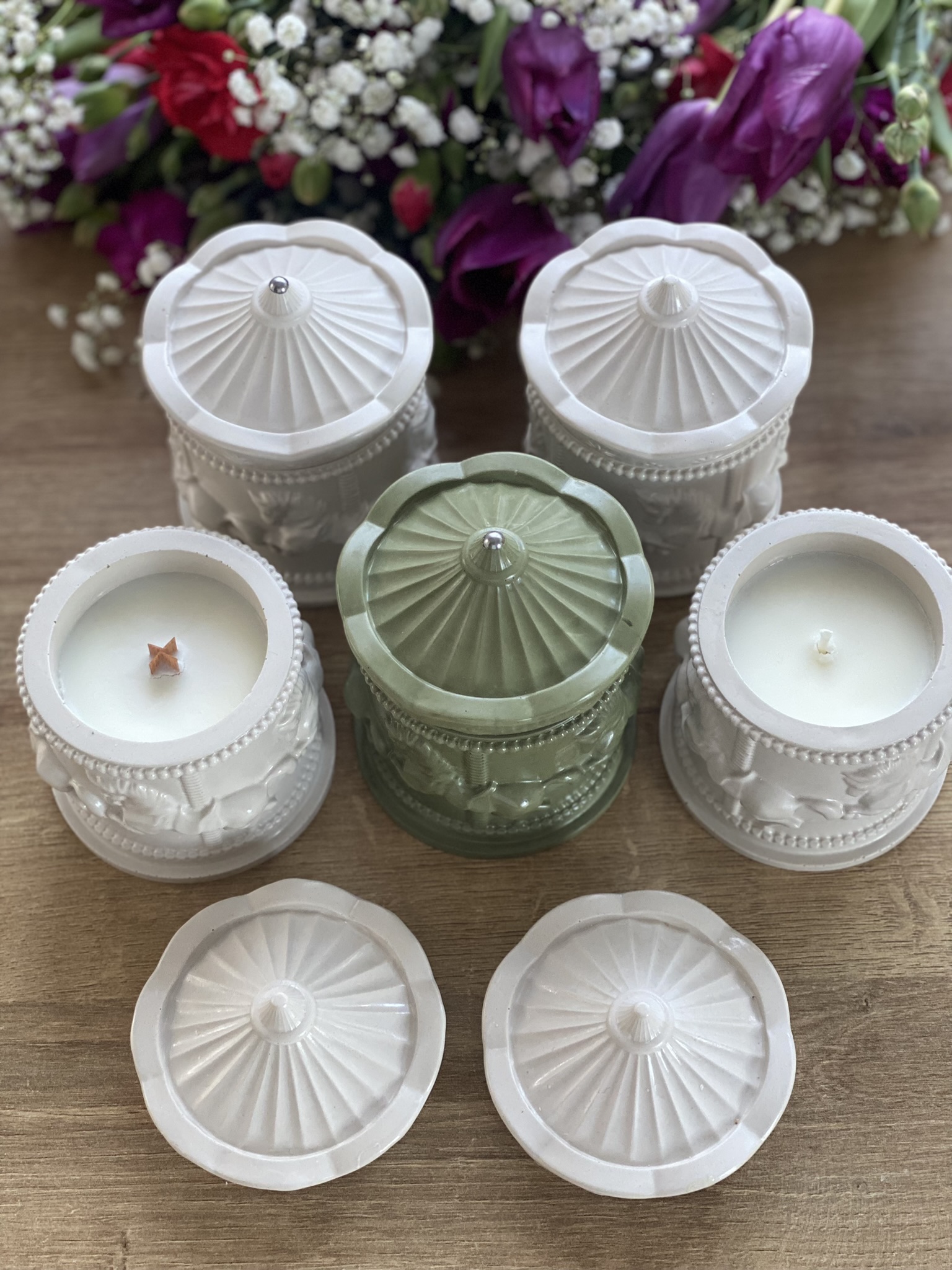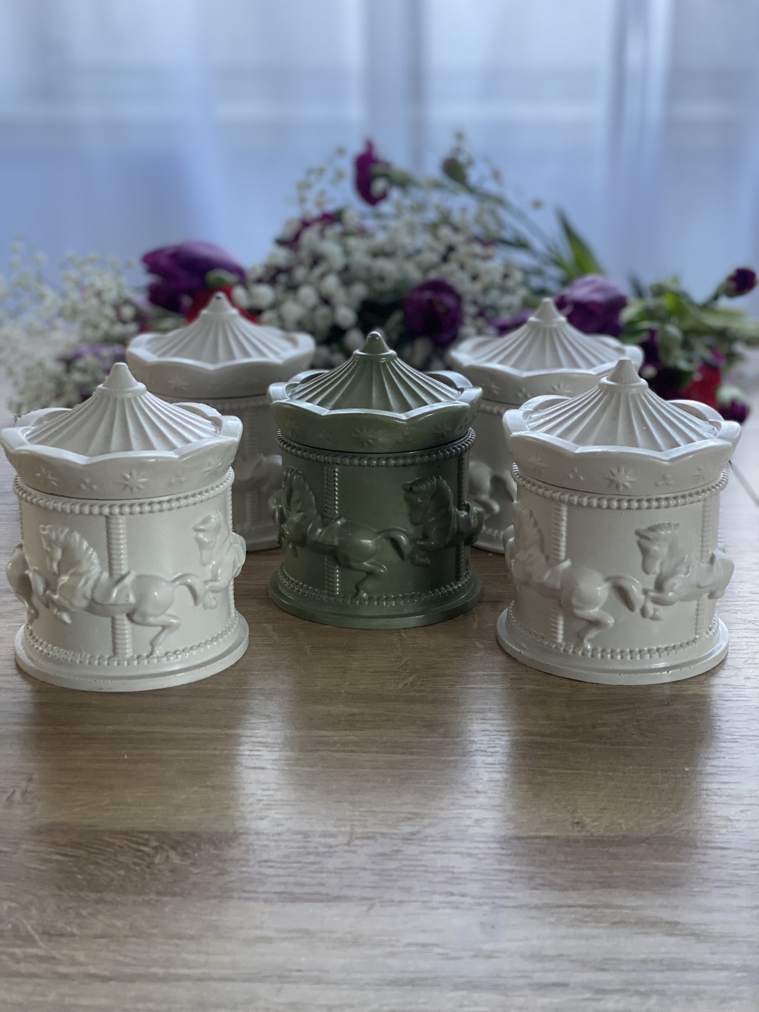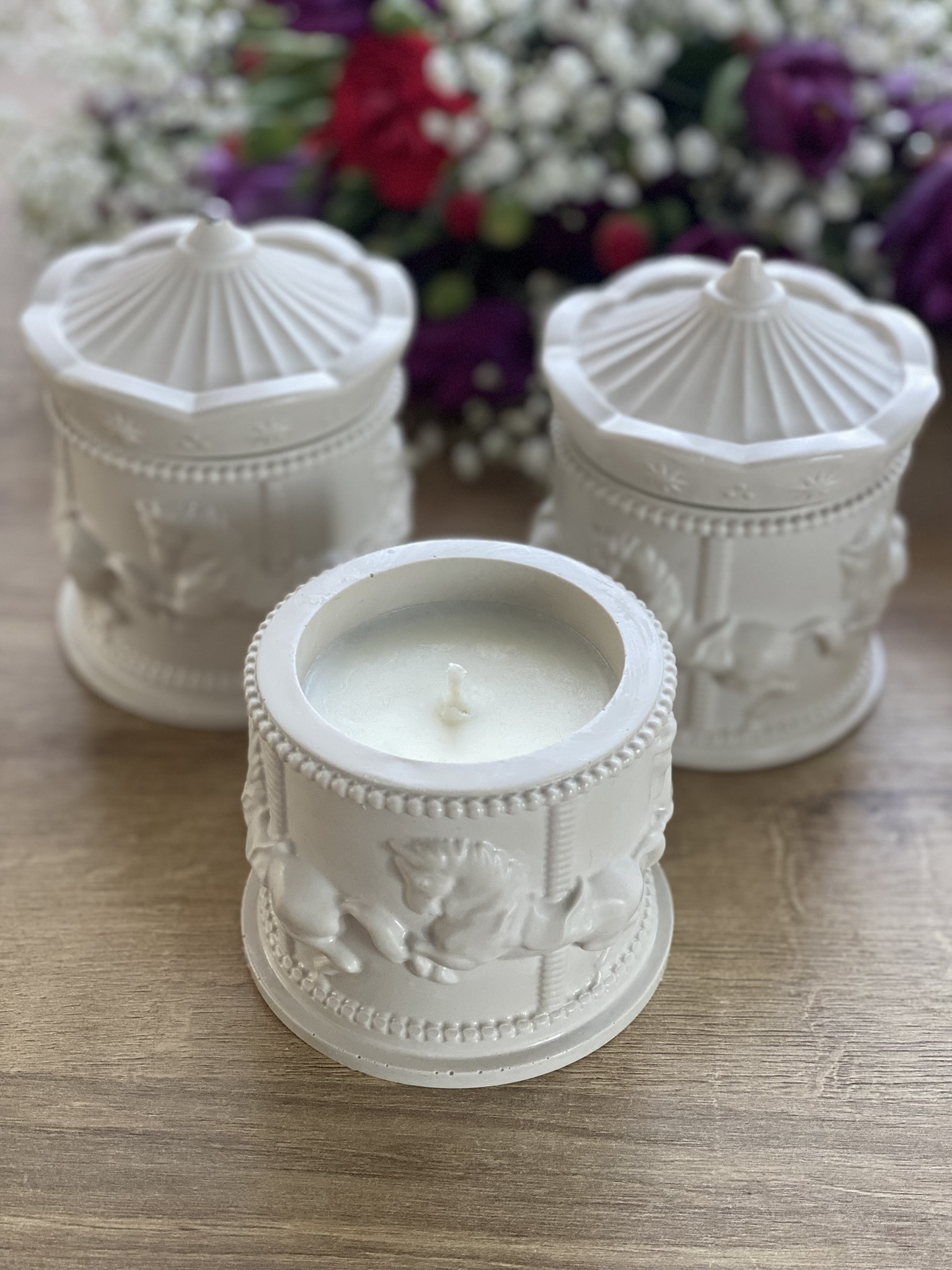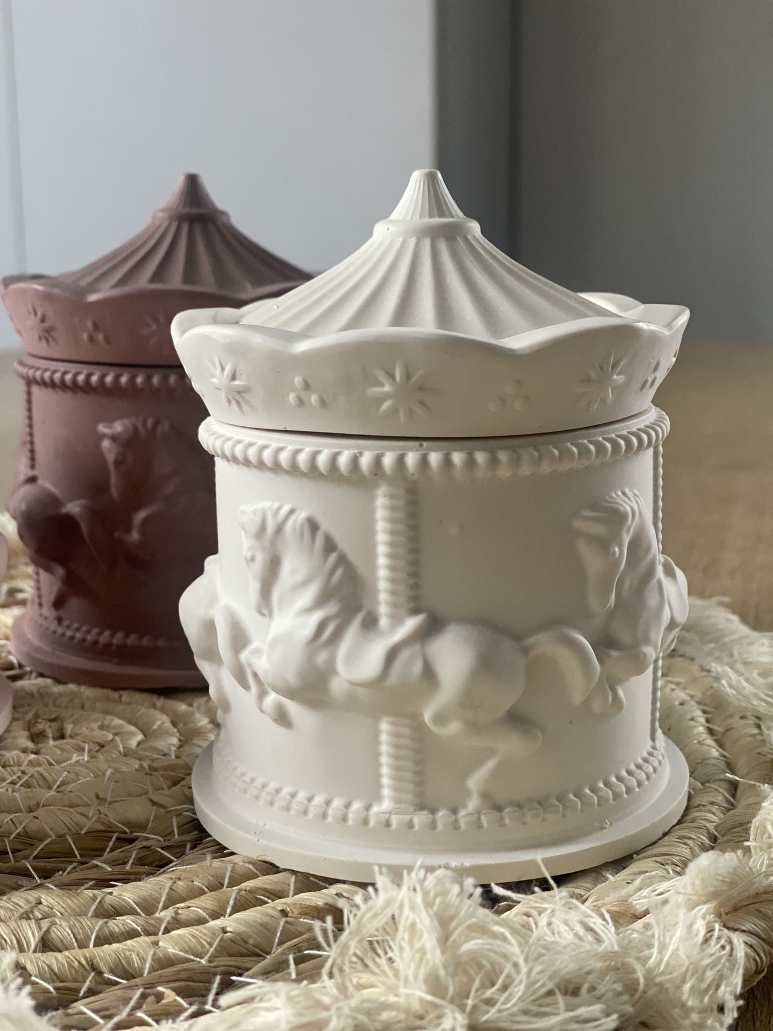 Karuzela to kolekcja świec zapachowych w gipsowych pojemnikach, które również wykonuję sama. Wiedząc, że moi klienci lubią róże zapachy, masz możliwość zaprojektowania własnej świecy i wybrania jednego z kilkunastu kompozycji zapachowych Kolekcji Basic. Świeca dostępna w pojemniku w naturalnym kolorze gipsu lub w pudrowym różu.