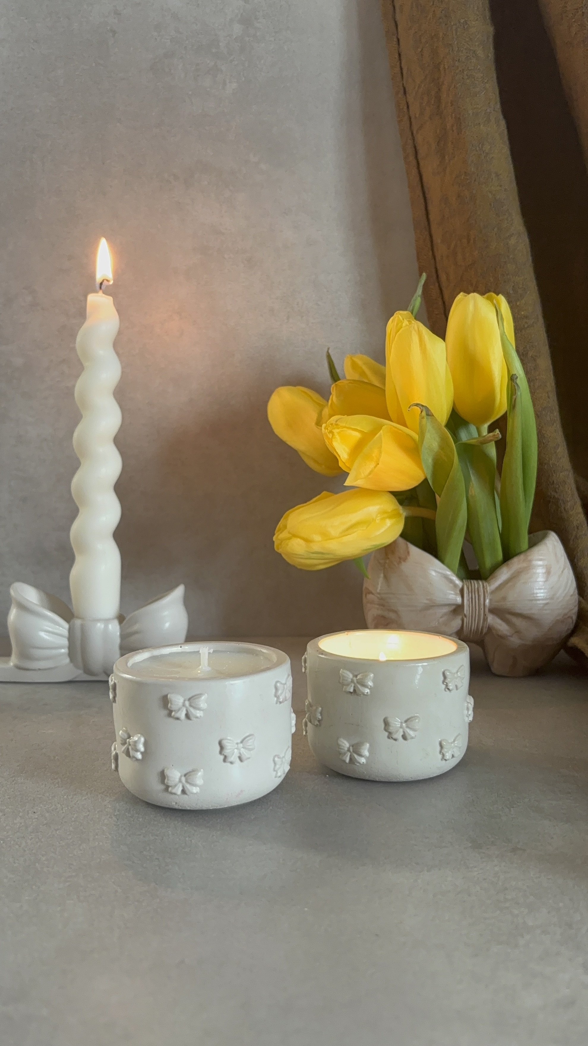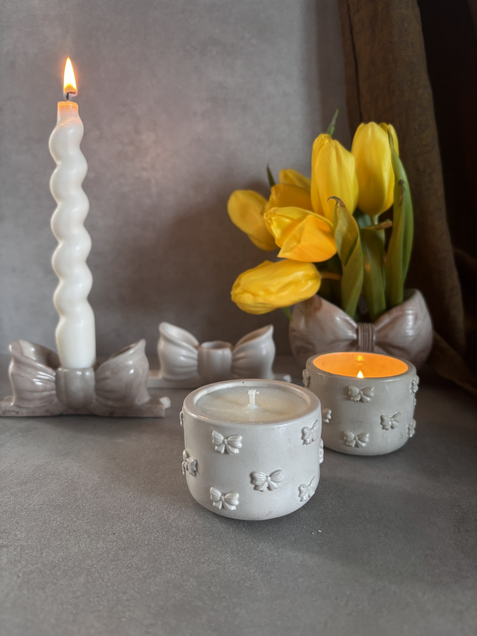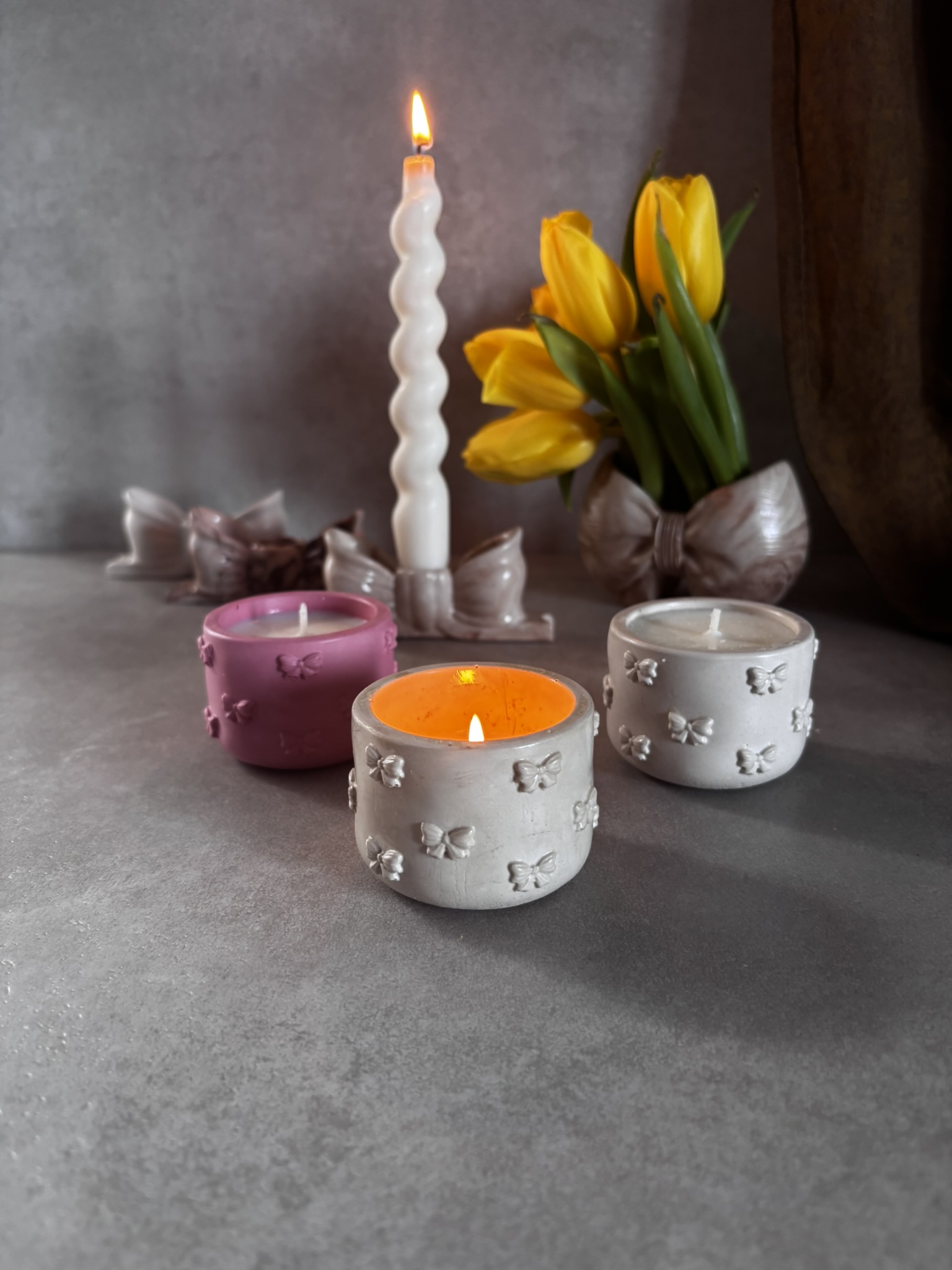 KOKARDKA MINI to jedna ze świec zapachowych w gipsowych pojemnikach zdobiona motywem kokardki.  Wiedząc, że moi klienci lubią mieć wybór, masz możliwość samodzielnego zaprojektowania świecy i wybrania jednego z kilkunastu kompozycji zapachowych kolekcji Basic. Świeca dostępna w pojemniku w naturalnym (jasnoszarym) kolorze gipsu.