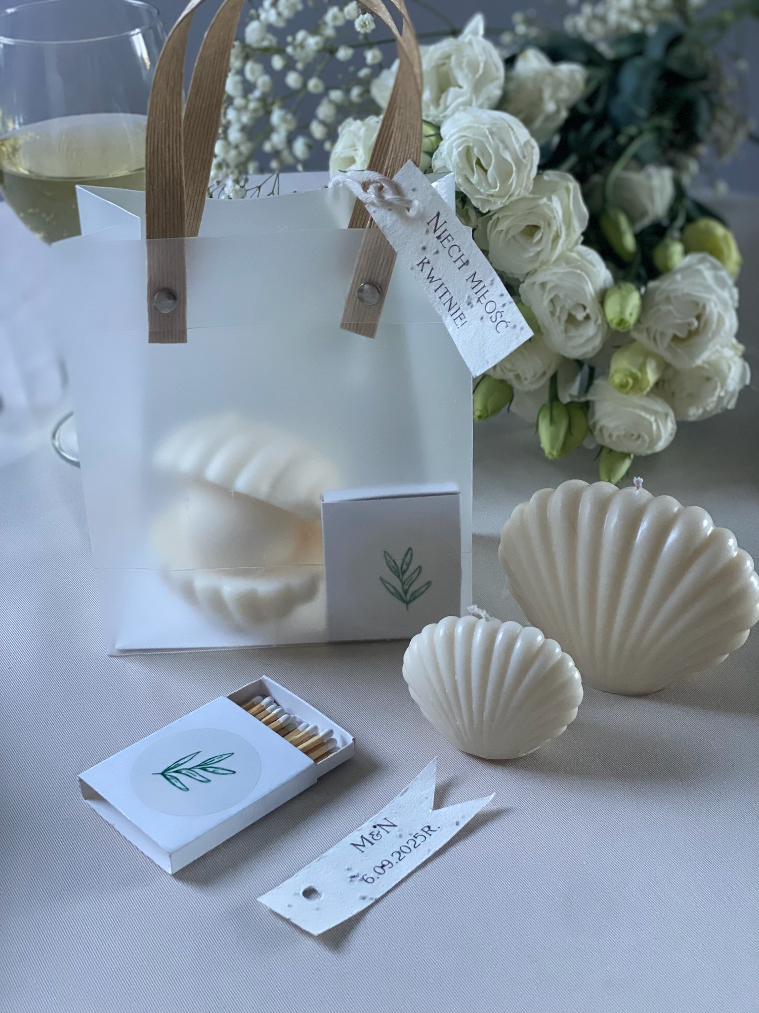 Torebka prezentowa (biała, półprzeźroczysta) oraz białe, eleganckie zapałki – cena 5 zł/ szt.