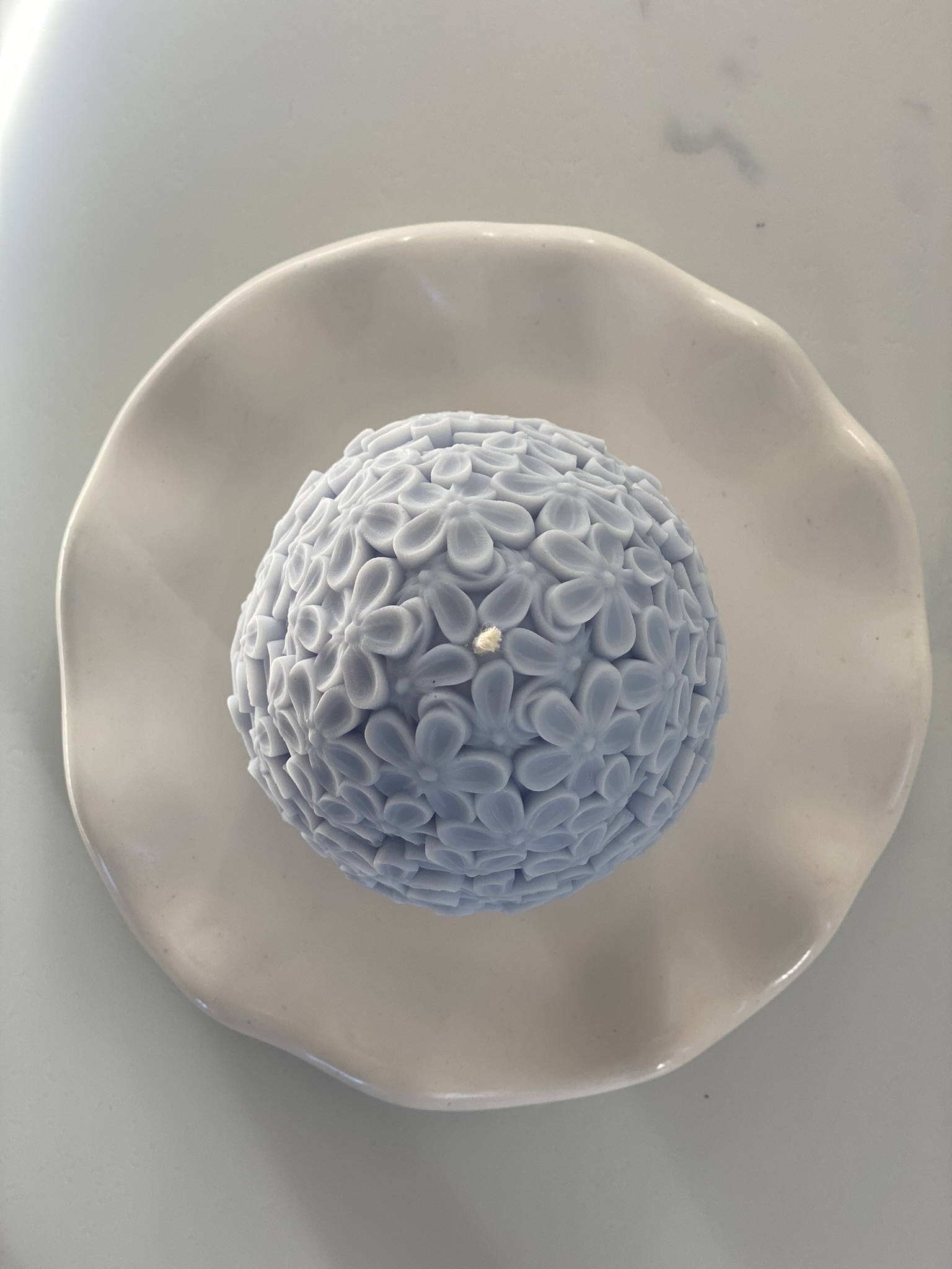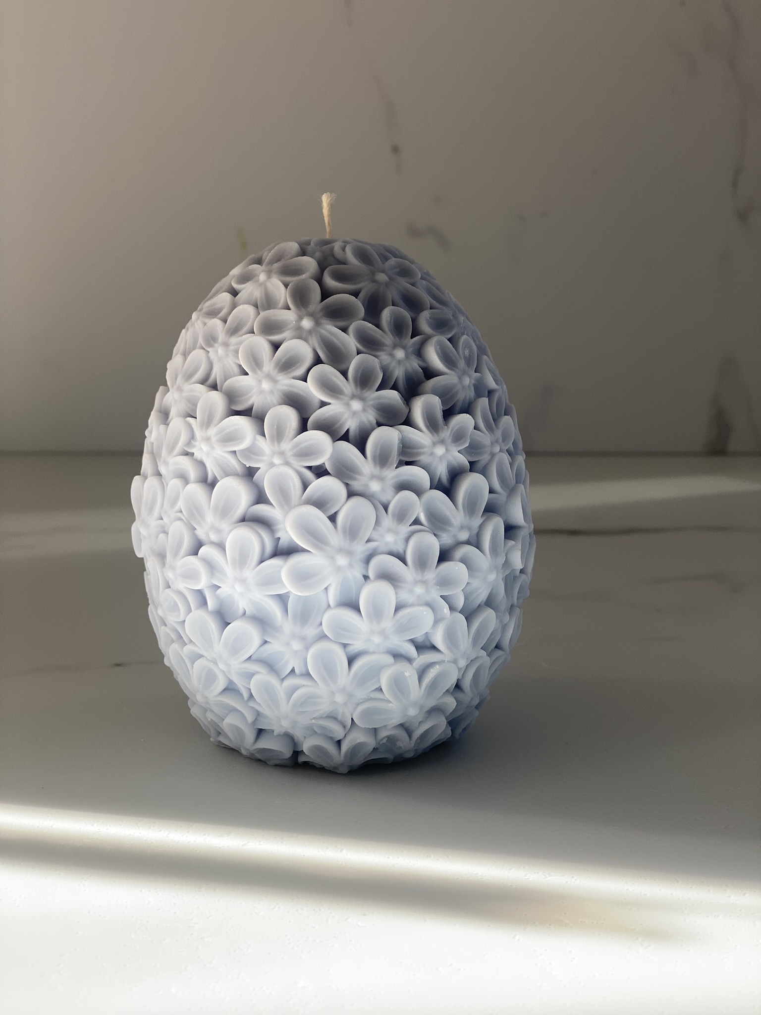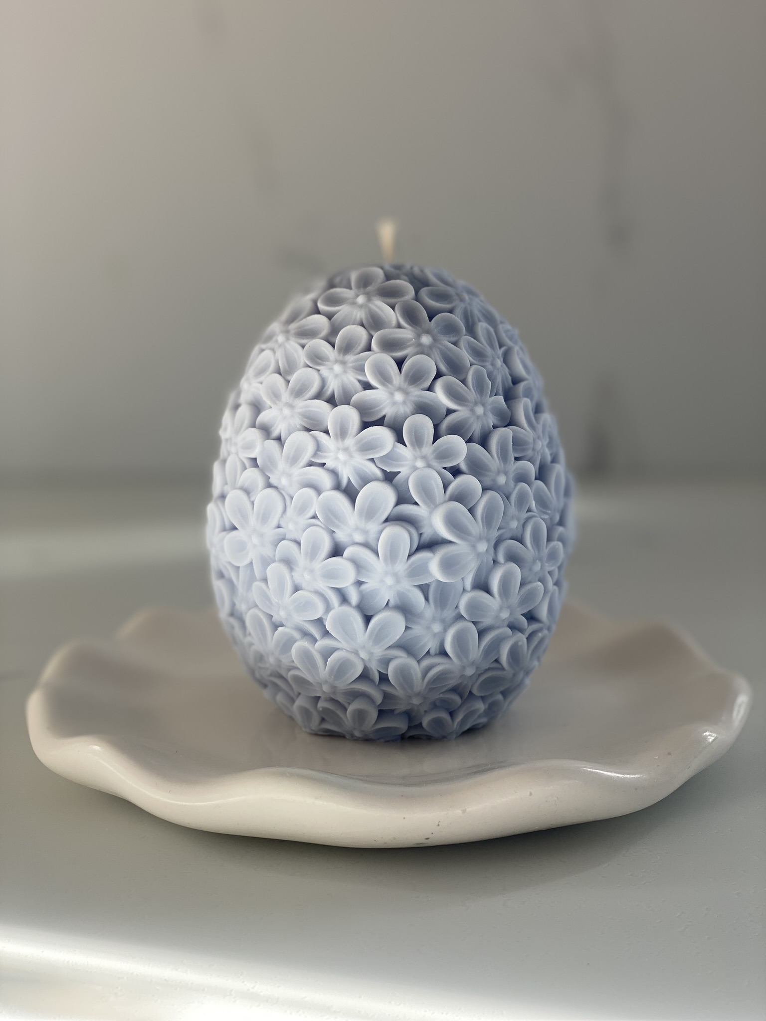 Kwiaty– to ręcznie robiona świeca sojowa w kształcie dużego jaja w kwiaty (bzu/ niezapominajki – zdania są podzielone). Czysta prostota składu i formy. Dostępne w naturalnym kolorze wosku (od złamanej bieli po ecru) bądź w pastelowych kolorach różu i błękitu.