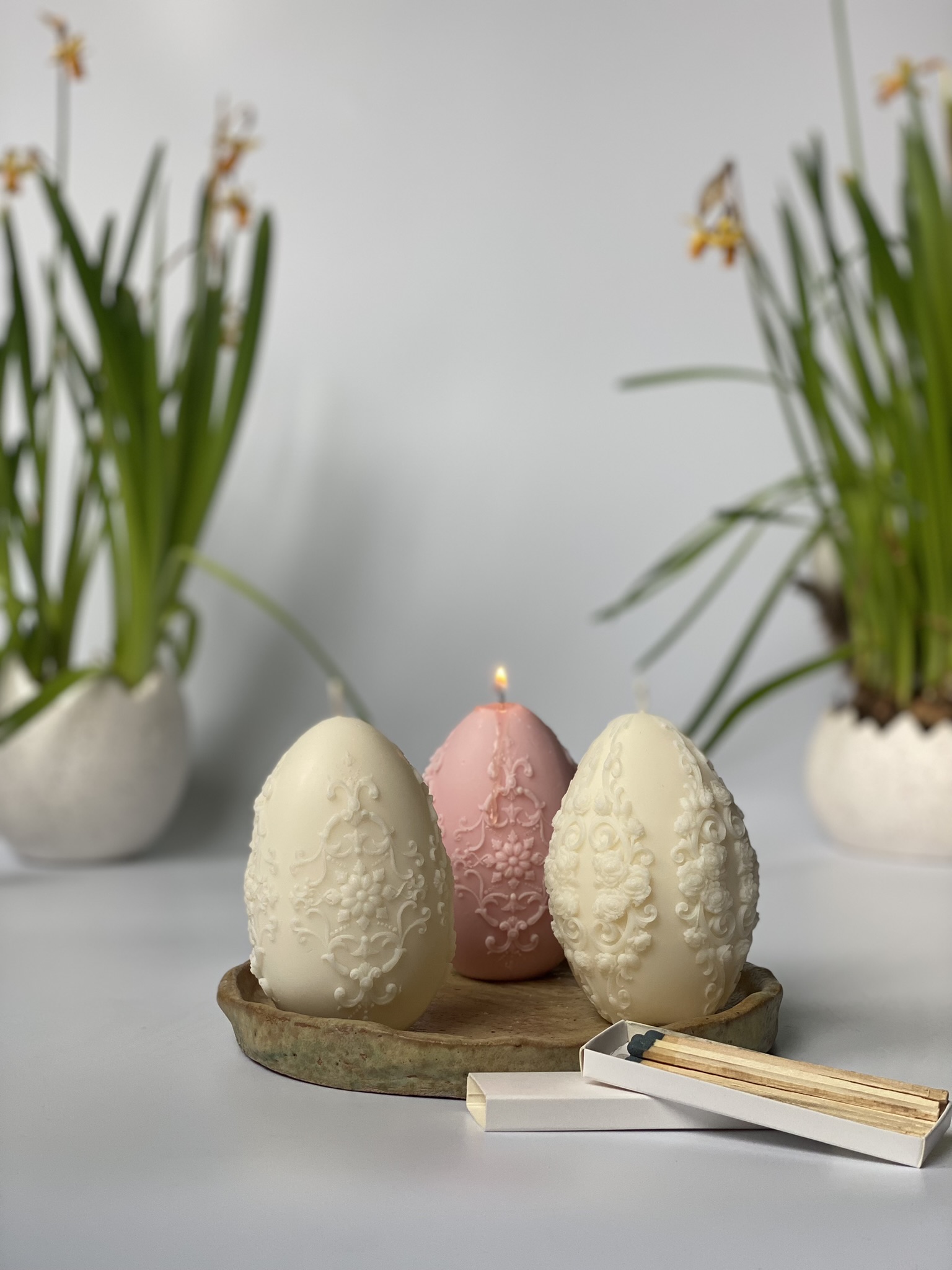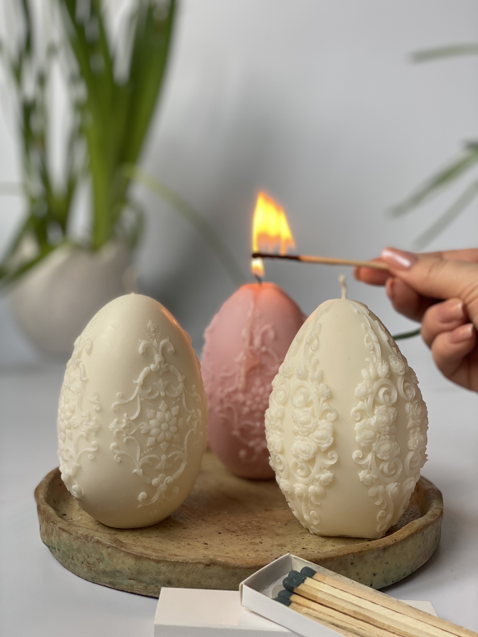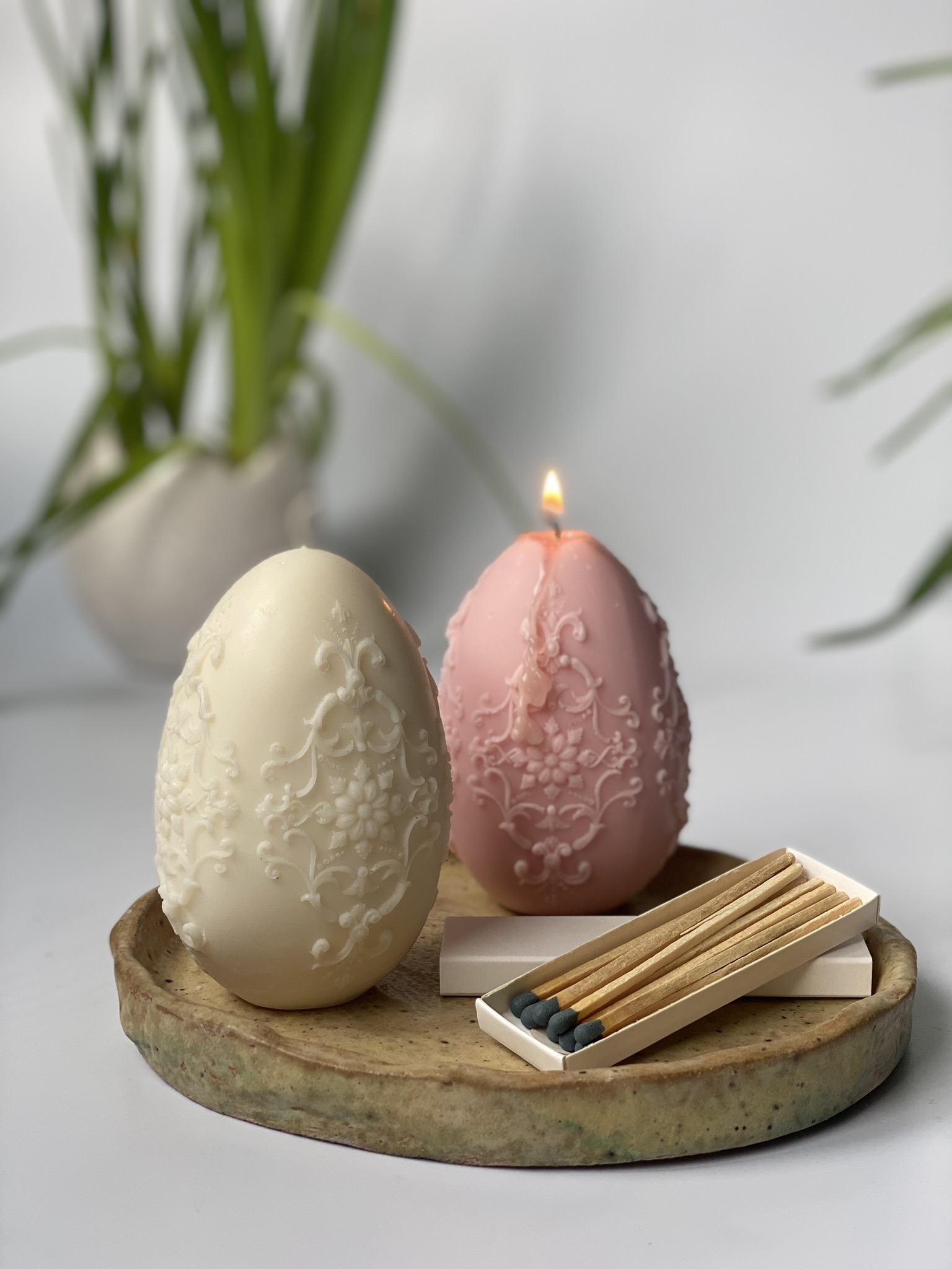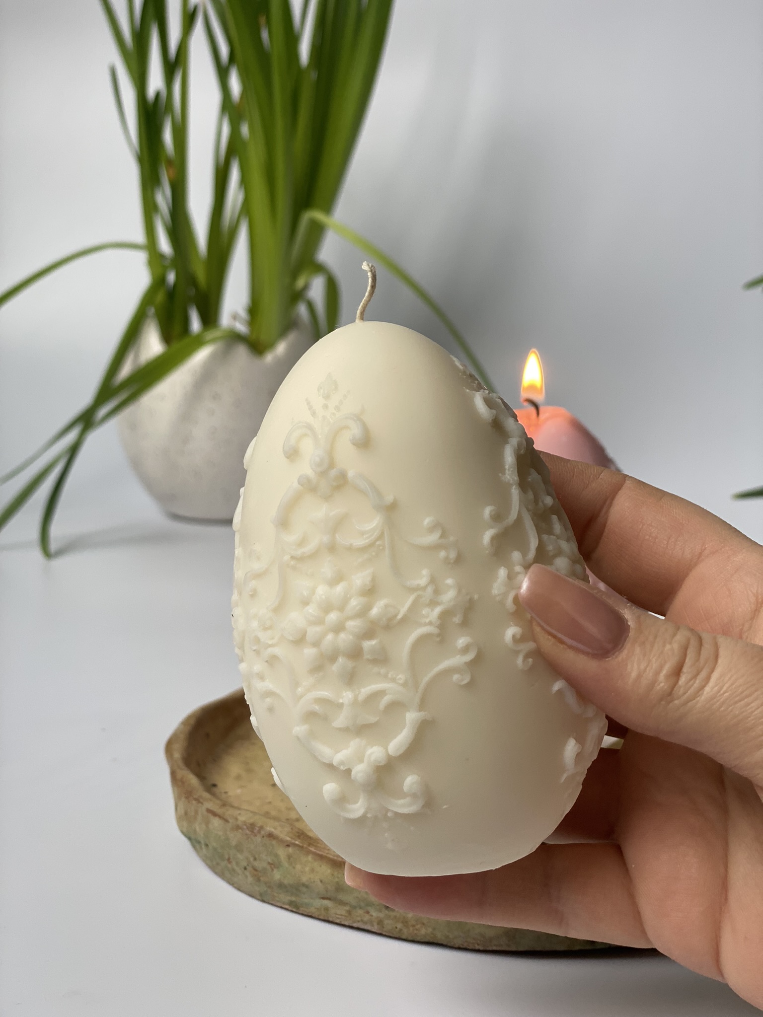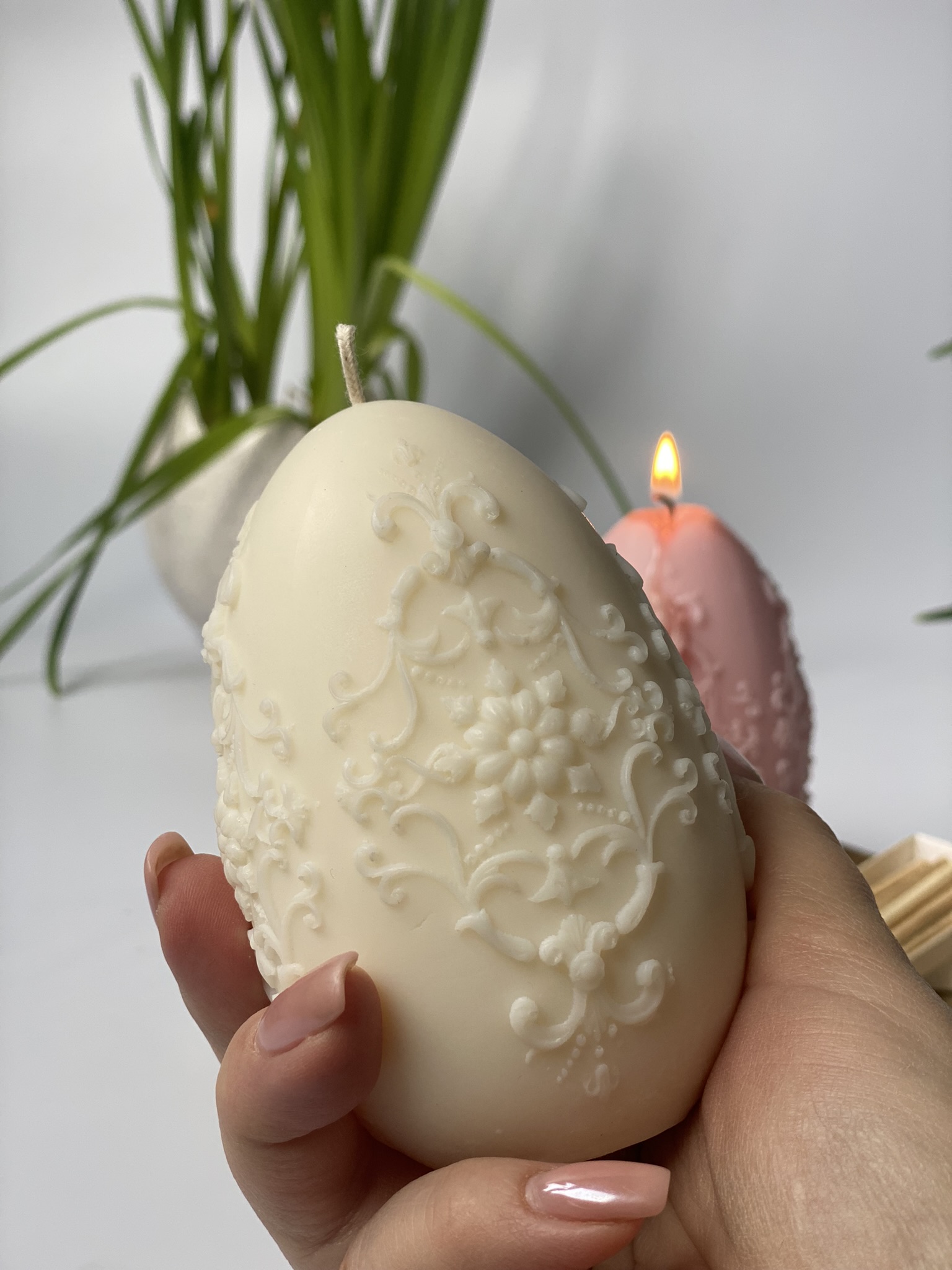 Pisanka XL Detal – to ręcznie robiona świeca sojowa w kształcie świątecznej dużej pisanki z pięknymi, drobnymi zdobieniami. Dzięki swojemu wyjątkowemu, eleganckiemu kształtowi, jest to nietuzinkowa i praktyczna ozdoba na Wielkanoc. Czysta prostota składu i formy. Dostępne w naturalnym kolorze wosku (od złamanej bieli po ecru) lub w jasnych, pastelowych kolorach: różowy, zielony, błękitny, pomarańczowy, liliowy, żółty. Zawsze używam wyłącznie barwików pochodzenia roślinnego.
