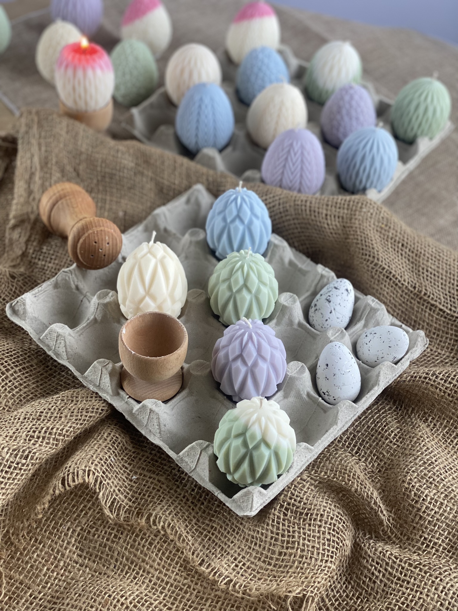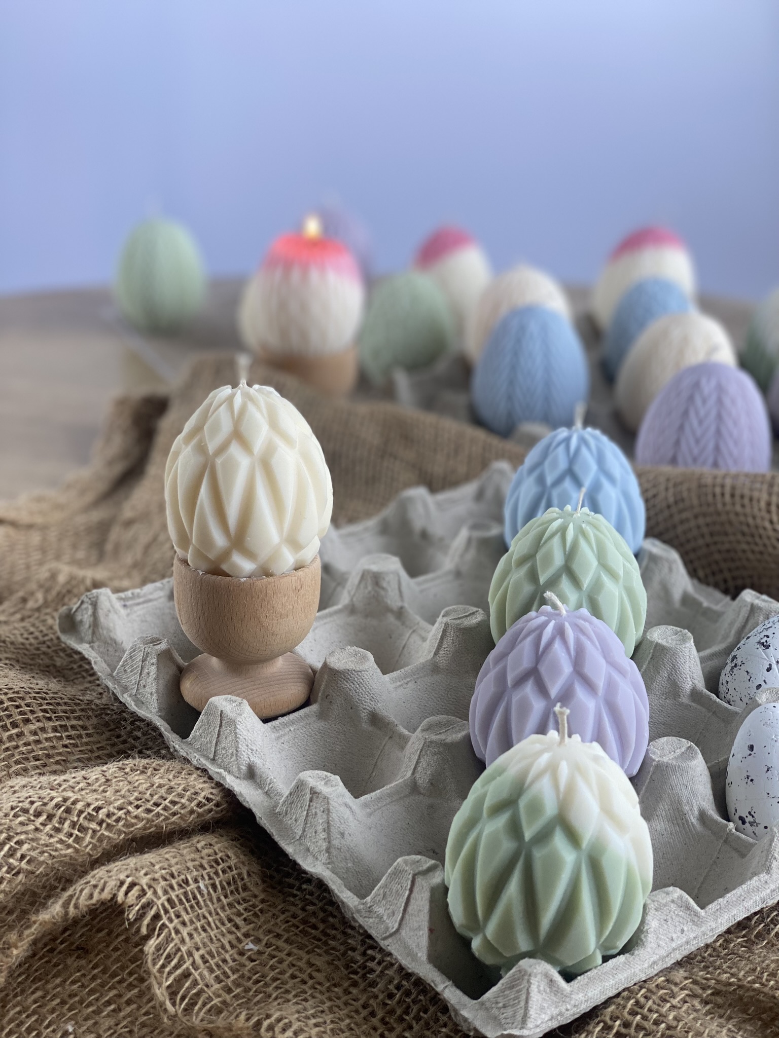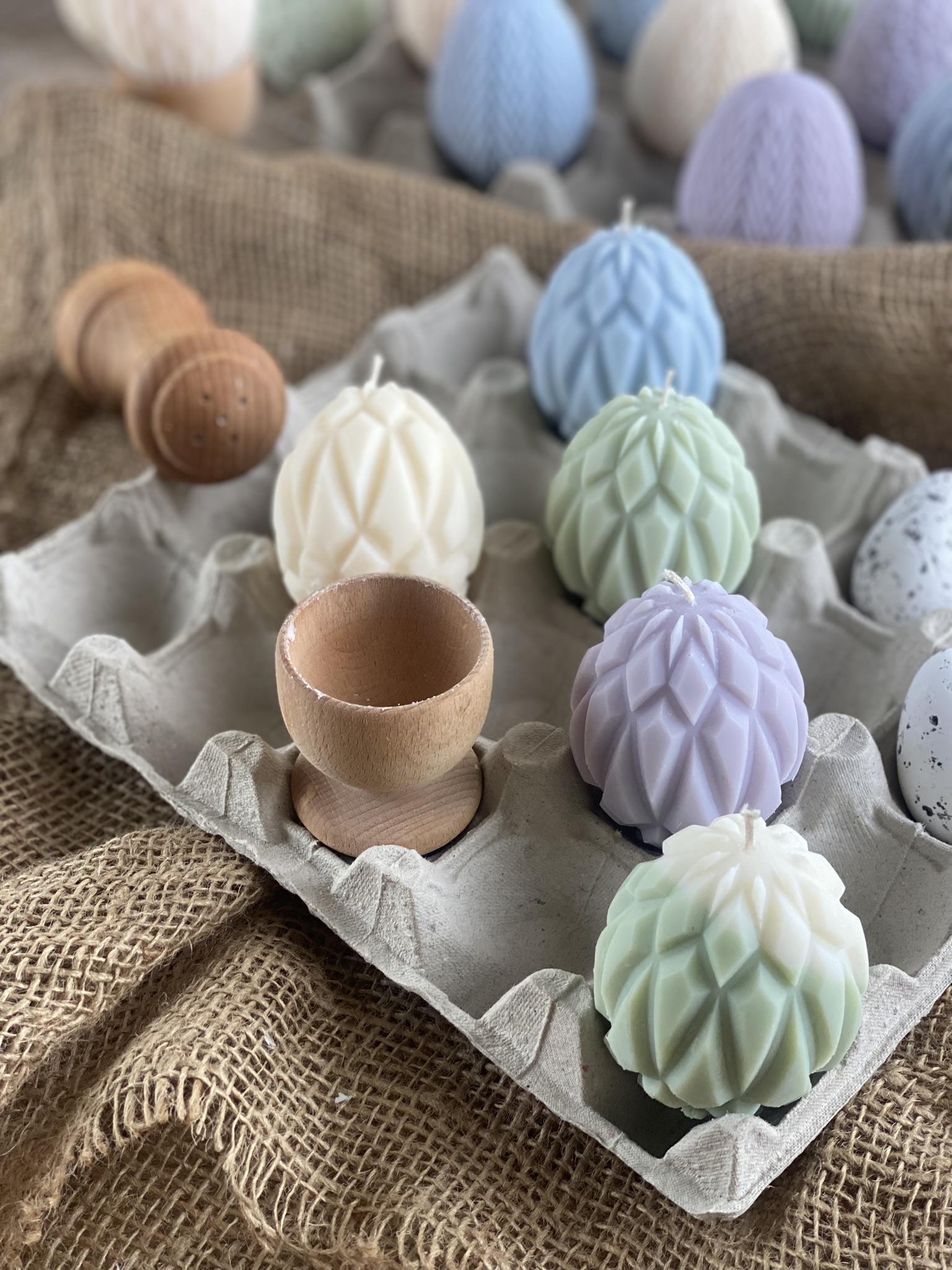Pisanki – Geometryczny wzór- to ręcznie robiona świeca sojowa w kształcie świątecznej pisanki z głębokim, geometrycznym żłobieniem ( wzór 2/3). Dzięki swojemu wyjątkowemu kształtowi jest to nietuzinkowa i praktyczna ozdoba na Wielkanoc. Czysta prostota składu i formy. Dostępne w naturalnym kolorze wosku (od złamanej bieli po ecru) lub w jasnych kolorach: różowy, zielony, błękitny, pomarańczowy, liliowy, żółty lub w wersji dwu kolorowej (naturalny + kolor). Zawsze używam wyłącznie barwików pochodzenia roślinnego.