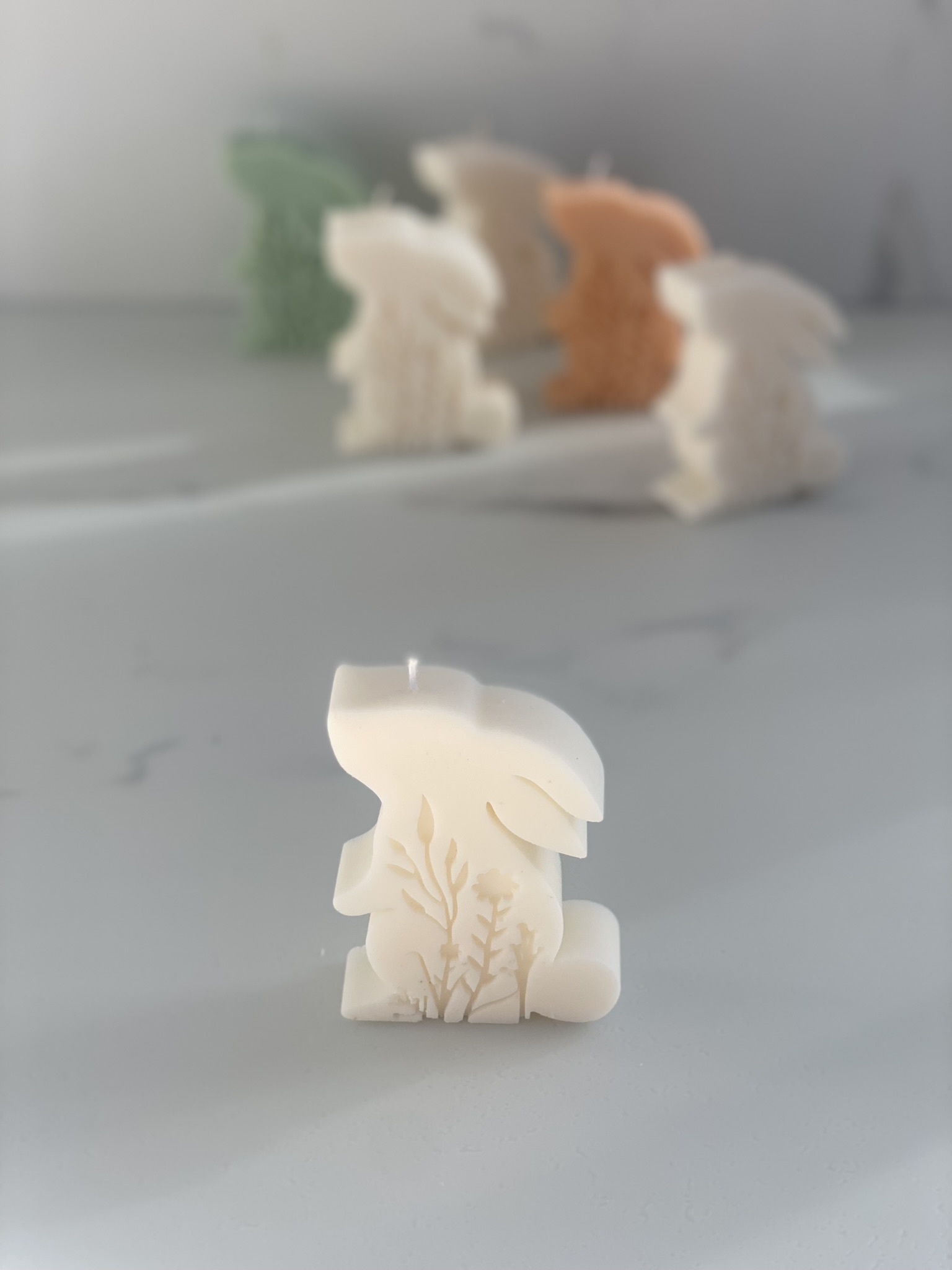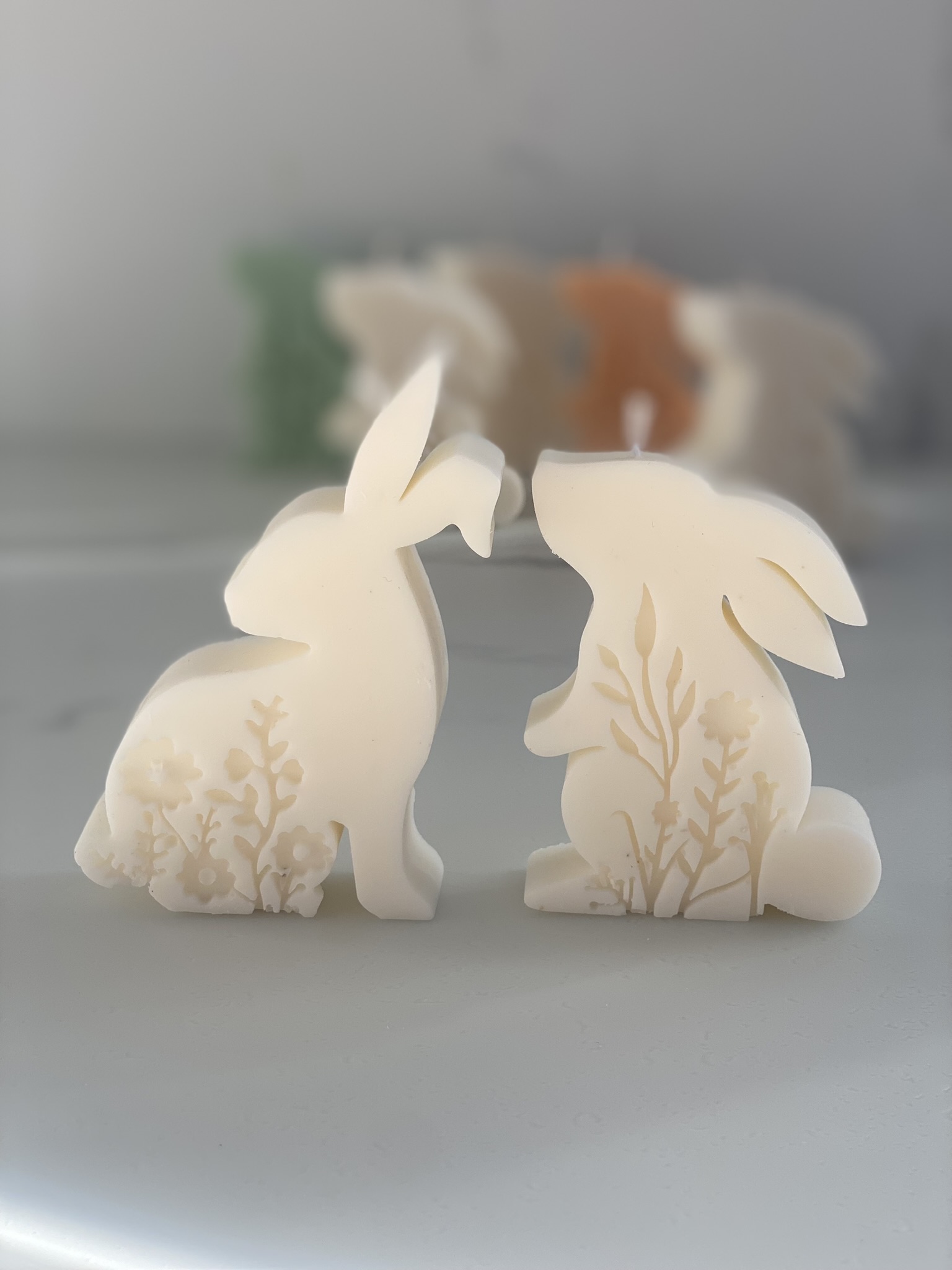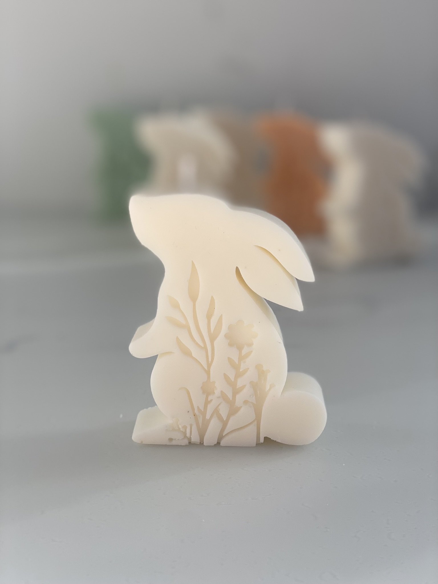 Zając Na Łące to   dwa urocze wzory do wyboru. Zajączki mają wyraźnie kwiatowe zdobienie. Dzięki swojemu wyjątkowemu kształtowi jest to nietuzinkowa i praktyczna ozdoba na Wielkanoc. Czysta prostota składu i formy. Dostępne w naturalnym kolorze wosku (od złamanej bieli po ecru) lub w jasnych kolorach: różowy, zielony, błękitny, pomarańczowy, liliowy.  Zawsze używam wyłącznie barwików pochodzenia roślinnego.